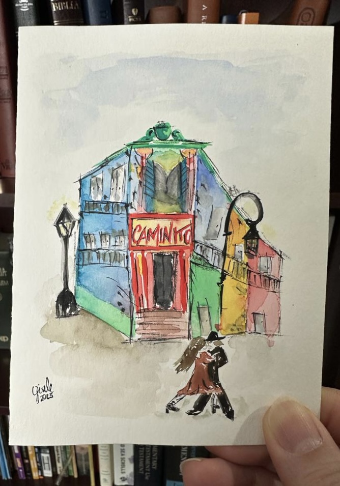 It was my father’s birthday this month and I decided to gift him with a card that would represent his roots. He was born and raised in Buenos Aires, Argentina, and el Caminito is one of its most famous alleys located in La Boca, mostly a touristic neighborhood, yet one of the most popular sites for local artists to make and sell their art.